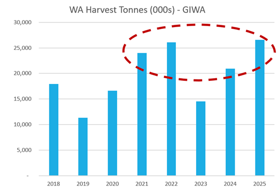 Although massive harvests are awesome news for WA broadacre farmers, it's not as awesome as it could be. Not only is WA producing more, everywhere else in the world is too. From Argentina to Russia, and from China to Brazil, tonnes are abundant and that depresses prices. It won’t just be specific to the current year either. The 25/26 WA harvest is already being sold over 12 months in advance, chiselling into demand for the yet-to-be-planted 26/27 crop.